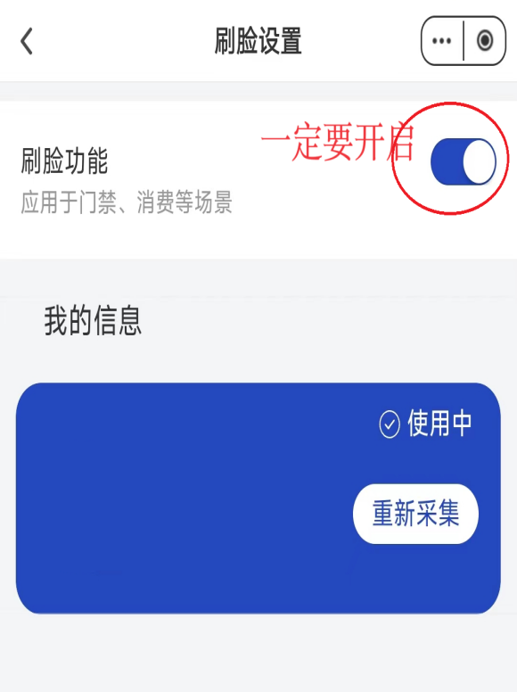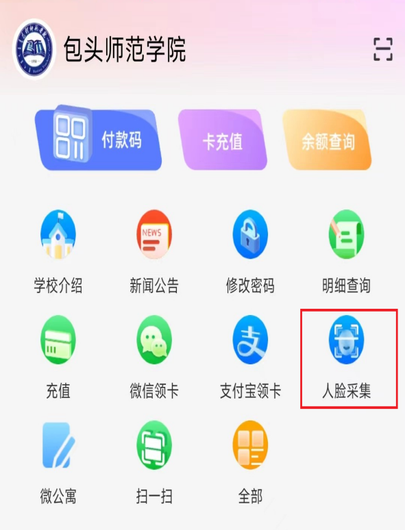 绑卡完成在首页点人脸采集,初次登录跳转到登录界面,输入学号/工号和密码(初始密码为身份证号后6位,字母“X”用数字“0”代替),进入人脸采集界面,开启刷脸功能,点击采集人脸就能进行人脸采集。采集成功后可以校门口、图书馆和公寓等门禁场景刷脸进出。
