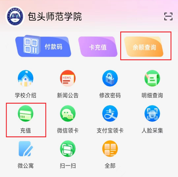 在首页点击“充值”模块,可以使用微信、支付宝、建行渠道进行充值,充值后可以在食堂消费使用。