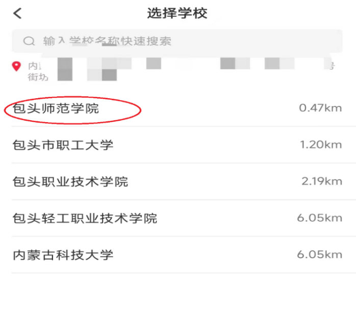 2、初次登录后系统会自动跳转至选择学校界面,或者在搜索框输入“包头师范学院”,点击下方出现的“包头师范学院”选项,完成学校的选择。