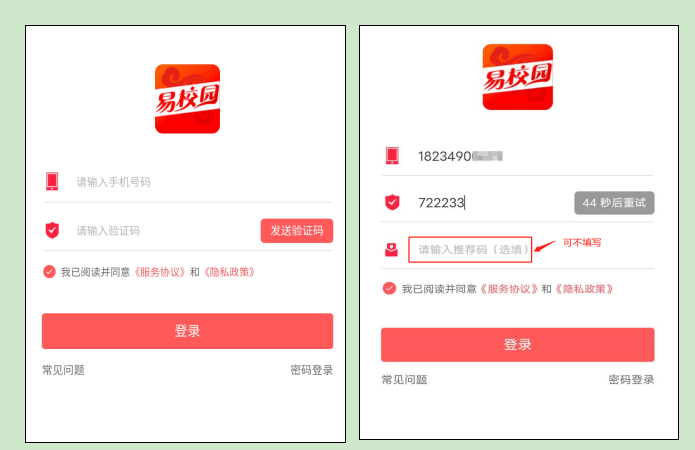 1、打开“易校园”APP,输入本人手机号码(此手机号要和微信注册的手机号同号!),点击“发送验证码”后填写验证码完成登录,其中“推荐码”可不填。